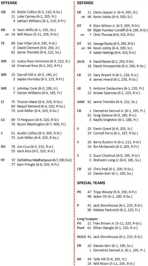 — Syracuse quarterbacks have thrown 10 interceptions, the 10th most in FBS. Sophomore Rickie Collins has thrown eight of those, going 68 of 127 (53.5%) for 733 yards and five touchdowns with 30 rushes for 102 yards and one touchdown. Collins has been the starter since Steve Angeli suffered a season-ending torn Achilles tendon in the win at Clemson.