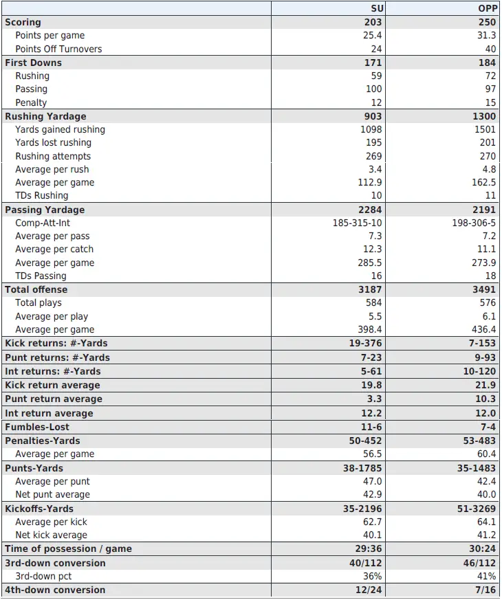 Syracuse vs. the spread: 3–4–1 — covered vs. Clemson +16½ (34–20), SMU +17½ (31–18) and Colgate -36½ (66–24); failed to cover vs. Tennessee +14½ (41–17), Duke +9½ (28–10), Pitt +6½ (24–13) and Georgia Tech +7½ (35–20); push vs. UConn +7 (27–20)