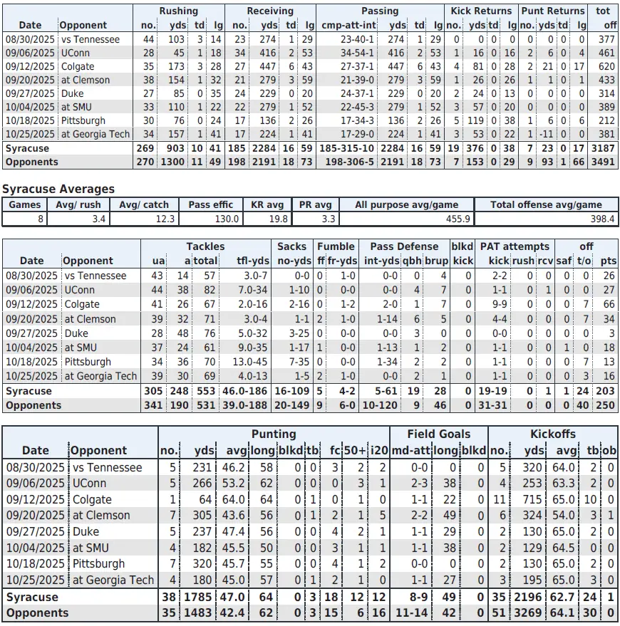 | Syracuse | 1–7 | 3–9 |
