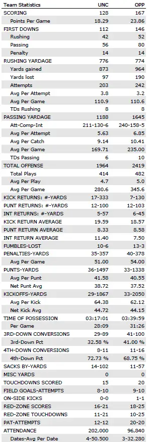 UNC vs. the spread: 4–3 — covered vs. Charlotte -17½ (20–3), Richmond -28½ (41–6), California +3½ (21–18) and Virginia +6½ (17–16); failed to cover against TCU +10½ (48–14), UCF +13½ (34–9) and Clemson -14½ (38–10)