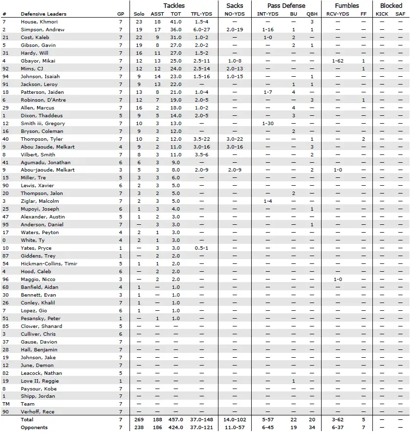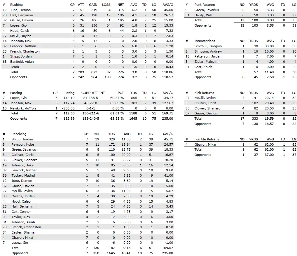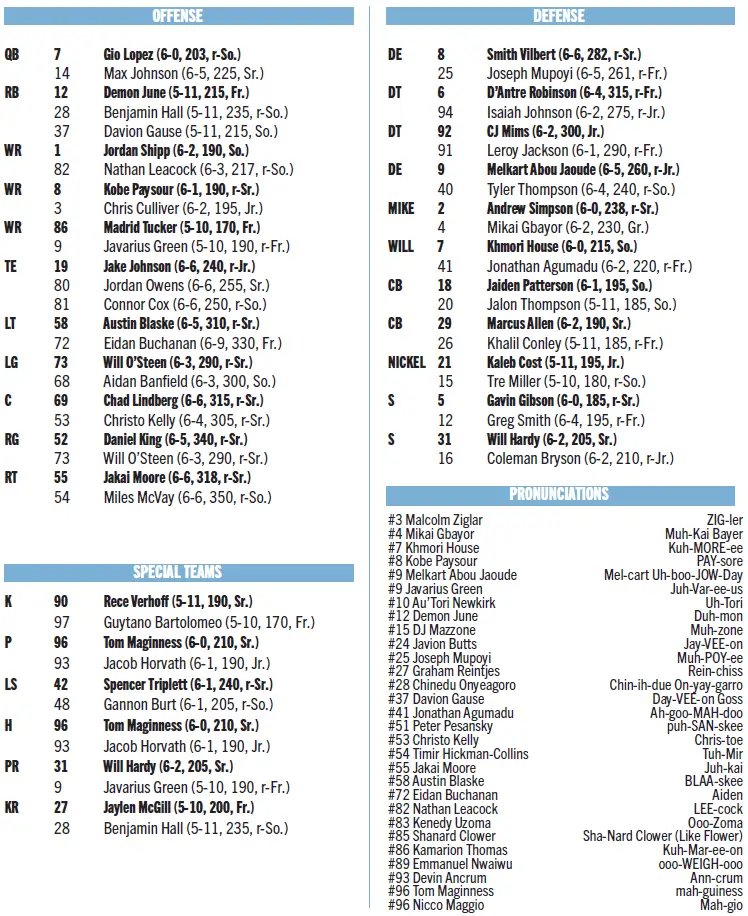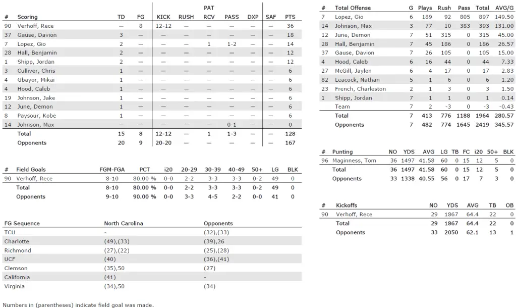 — The Tar Heels’ defense is 25th nationally in rushing defense (110.6 yards per game allowed) and 50th in total defense (345.6 yards per game) after shutting out Virginia in the second half.
