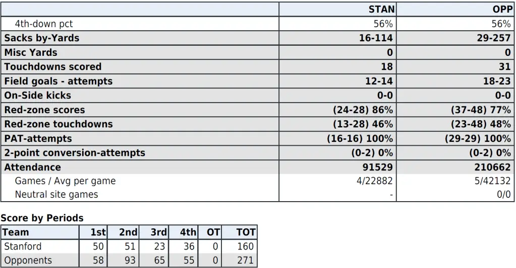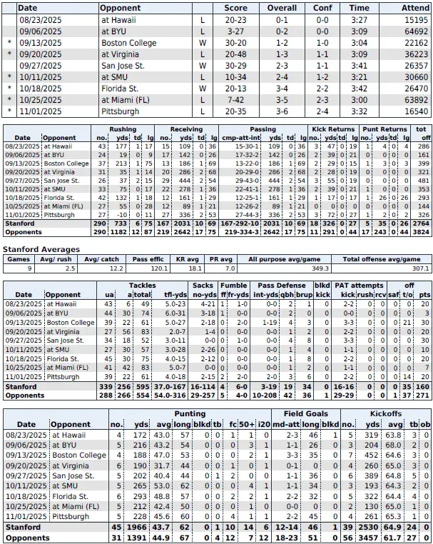 — Stanford has lost 10 consecutive road games and will go winless on the road for the first time since 2002 with a loss. The Cardinal’s last road win was 28–24 at Syracuse on Sept. 20, 2024.