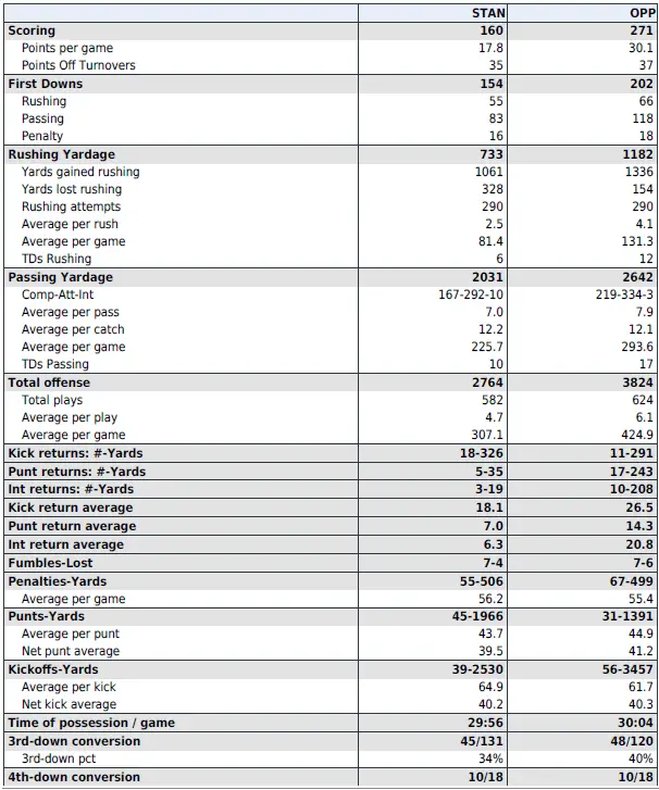Stanford vs. the spread: 2–7 — covered vs. Boston College +14 (30–20 win) and Florida State +17½ (20–13 win); failed to cover at Hawai’i +2½ (23–20 loss), BYU +20½ (27–3 loss), Virginia +16 (48–20 loss), SMU +19½ (34–10 loss) and Miami +28½ (42–7 loss), and vs. San Jose State -3 (30–29 win) and Pittsburgh +13½ (35–20 loss)