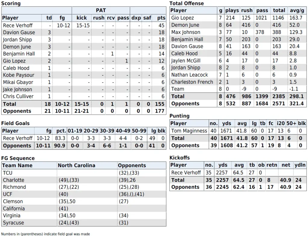 UNC vs. the spread: 5–3 — covered vs. Charlotte -17½ (20–3 win), Richmond -28½ (41–6 win), California +3½ (21–18 loss ) and Virginia +6½ (17–16 loss) and at Syracuse +2½ (27–10 win); failed to cover against TCU +10½ (48–14 loss), UCF +13½ (34–9 loss) and Clemson -14½ (38–10 loss)