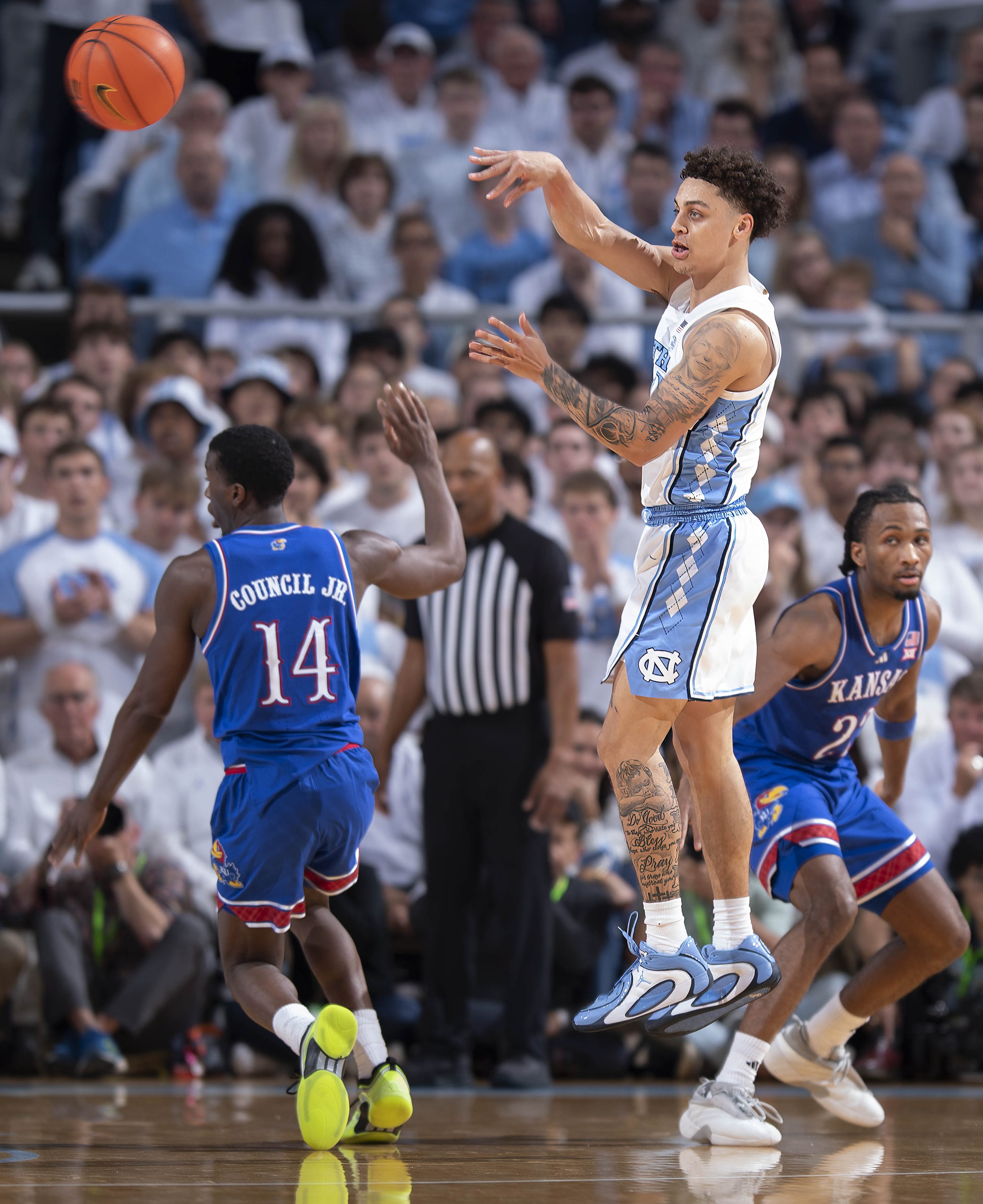 In the first half of No. 25 UNC’s 87–74 victory Friday night over No. 19 Kansas at the Smith Center, Evans looked out of rhythm. The Jayhawks made a concerted effort to get the ball out of his hands, and he struggled to respond.