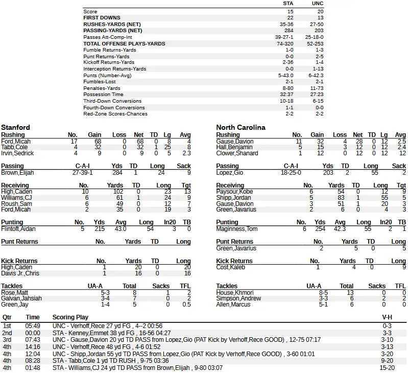 Stanford failed on an onside kick. After UNC went three-and-out, Stanford’s last-ditch drive fell short.