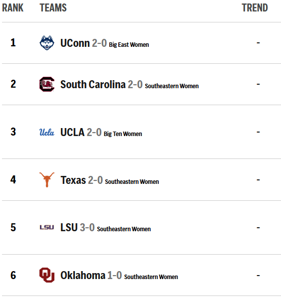 It’s the first time that North Carolina has been in the top 11 for two consecutive weeks since last season, when it was No. 9 on Feb. 17 and No. 8 on Feb. 24. The longest previous such streak was five consecutive weeks from Nov. 21 to Dec. 19 in 2023, when UNC was as high as No. 6 and no lower than No. 8.
