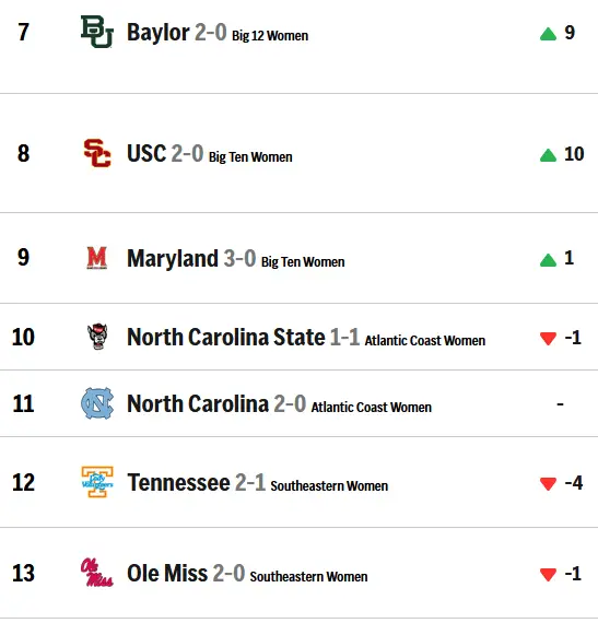 — The Wolfpack (1–1) slipped one spot to No. 10 after beating the Lady Vols but losing 69–68 Sunday in Charlotte to Southern Cal (2–0), which leaped 10 spots to No. 10.