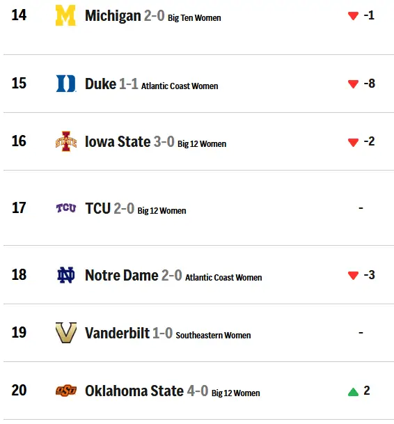 — Duke (1–1) fell eight spots to No. 15 after losing 58–52 in Paris to Baylor (2–0), which moved up nine spots to No. 7,