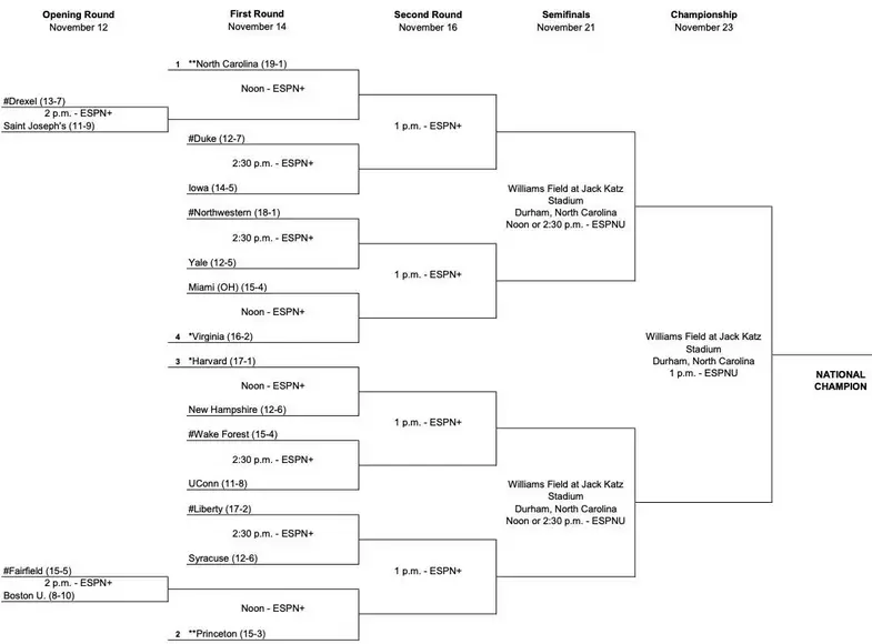 Also in the Chapel Hill bracket, Iowa (14–6) and Duke (12–7) will meet at 2:30 p.m., with the winners of the first-round games meeting at noon Sunday for a spot in the national semifinals.