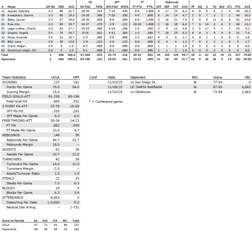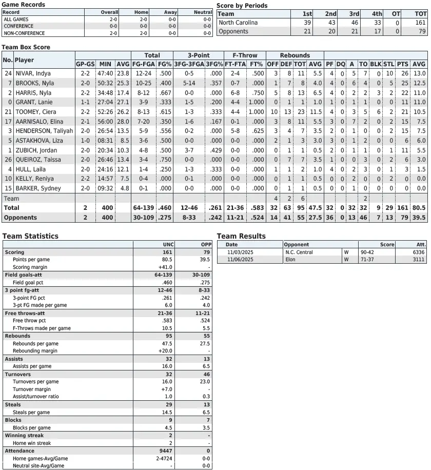 Injuries: Kelly played limited minutes in the first two games (likely still working her way back from a right knee injury last season), and sophomore Blanca Thomas (undisclosed injury) hasn’t played in either game or the Tar Heels’ exhibition game. Thomas was wearing uniform shorts as the team watched Thursday’s first game from the stands .Harris spent a good amount of time on an exercise bike during Thursday’s 73–37 win over Elon. Freshman UCLA forward Sienna Betts, the No. 2 player in the Class of 2025 and Lauren Betts’ sister, missed the Oklahoma game with a lower-leg injury and Close said Wednesday that she and Timea Gardiner will miss the game.