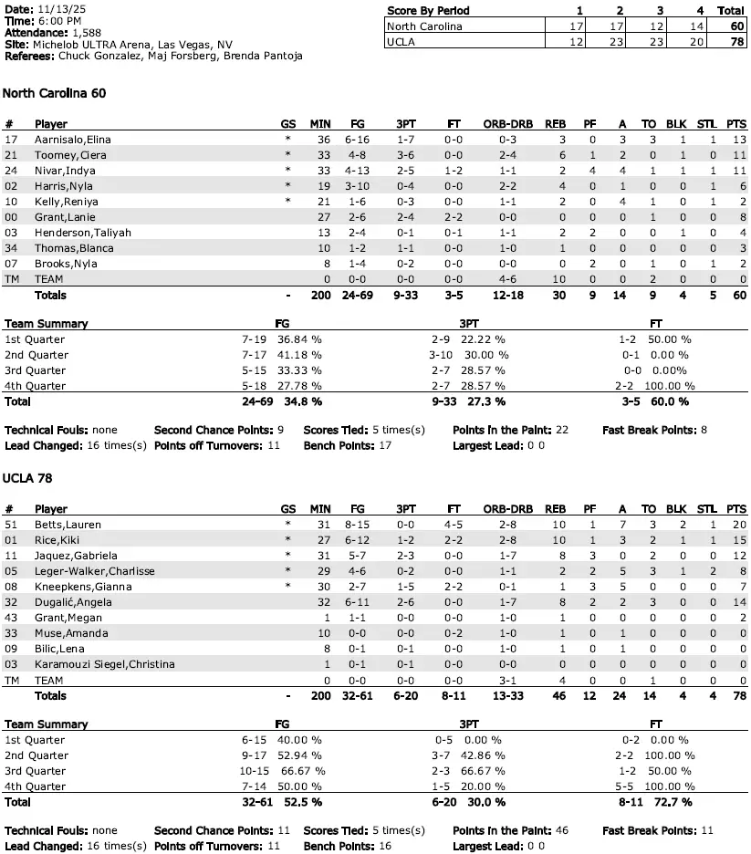 After UNC held UCLA to its lowest first-half scoring output of the season and only trailed by one, the Bruins poured it on with a 10–0 third-quarter run and coasted to a 78–60 victory Thursday in the WBCA Challenge at the Michelob Ultra Arena.