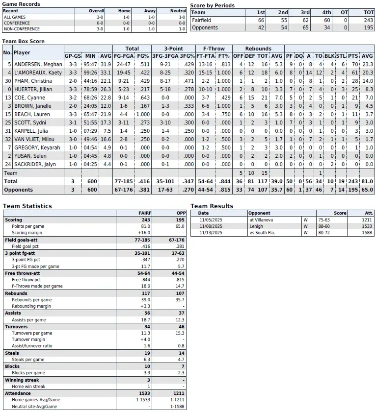 | 15 | Saturday | W, 82–68 | vs. Fairfield | 3–1 |