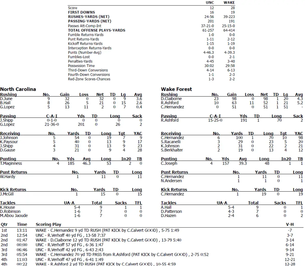 Wake Forest made enough big plays and every promising UNC drive sputtered as the Demon Deacons ended a four-game losing streak against the Tar Heels with a 28–12 win Saturday night at Allegacy Stadium.