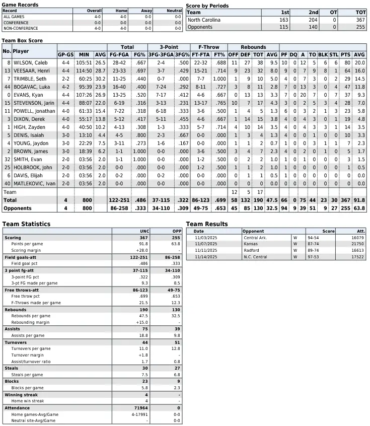 UNC season statistics