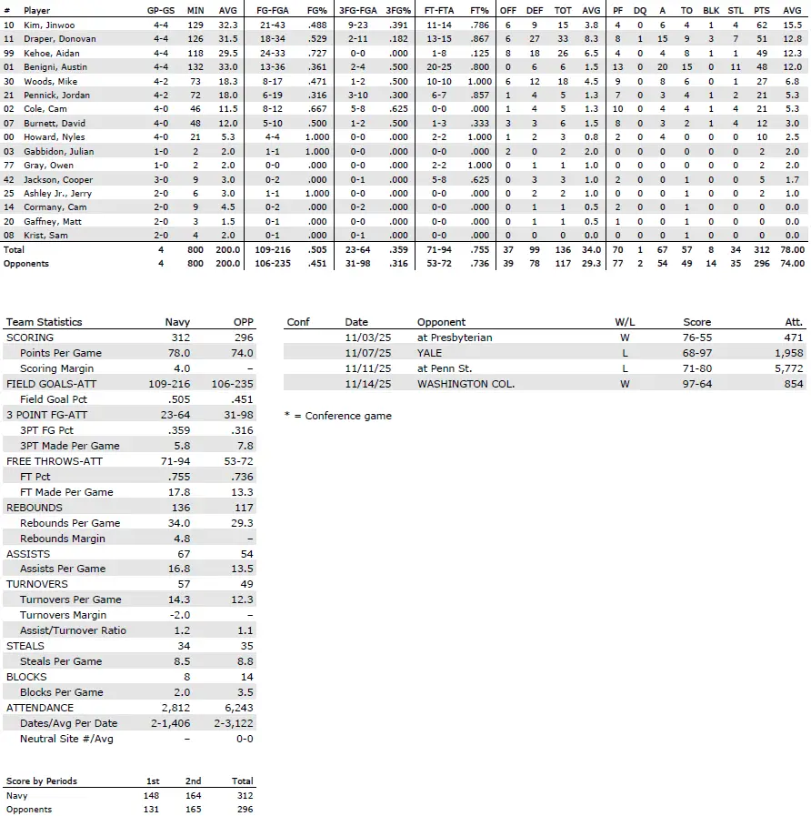 — Navy, which lists 25 players on its roster, leads the Patriot League in scoring (78 points per game), field-goal percentage (50.5%), defensive rebounding (29.25), assists (16.75) and steals (8.5).