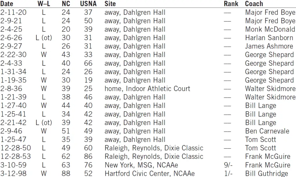 — Naismith Basketball Hall of Famer Ben Carnevale was UNC’s coach when it made its first NCAA tournament championship appearance in 1946 (losing to Oklahoma A&M), then left to become Navy’s coach the following season. He coached the Midshipmen until 1966, compiling a 257–160 record after going 52–11 in two seasons at Carolina. His Navy team beat Coach Frank McGuire’s No. 9-ranked Tar Heels 76–63 in the first round of the 1958 NCAA tournament.