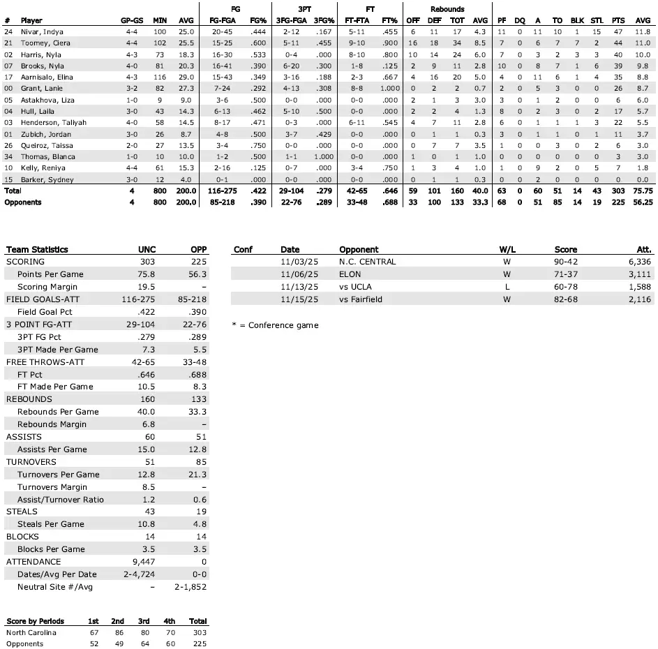 — This is Carolina’s first true road game of the season. Their second one is Dec. 4 in the ACC/SEC Women’s Challenge against No. 4 Texas. UNC is 4–2 in road openers under Coach Courtney Banghart, with the four wins coming in the last four seasons.