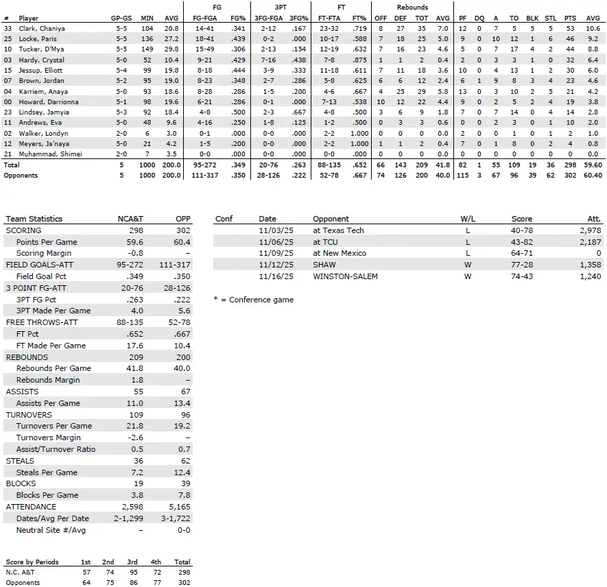 — The Aggies’ only two wins have come at home against Division II competition (77–28 against Shaw and 74–43 against Winston-Salem State), with road losses against Texas Tech (78–40), TCU (82–43) and New Mexico (71–64).