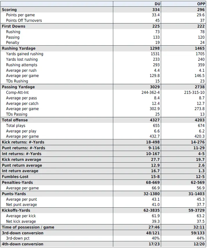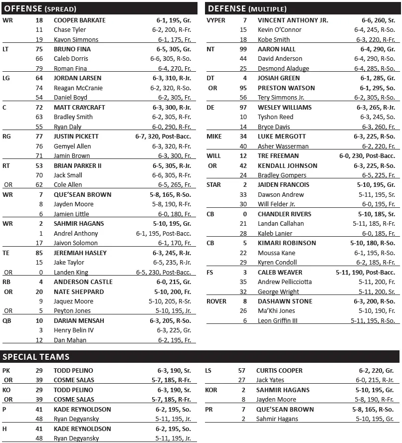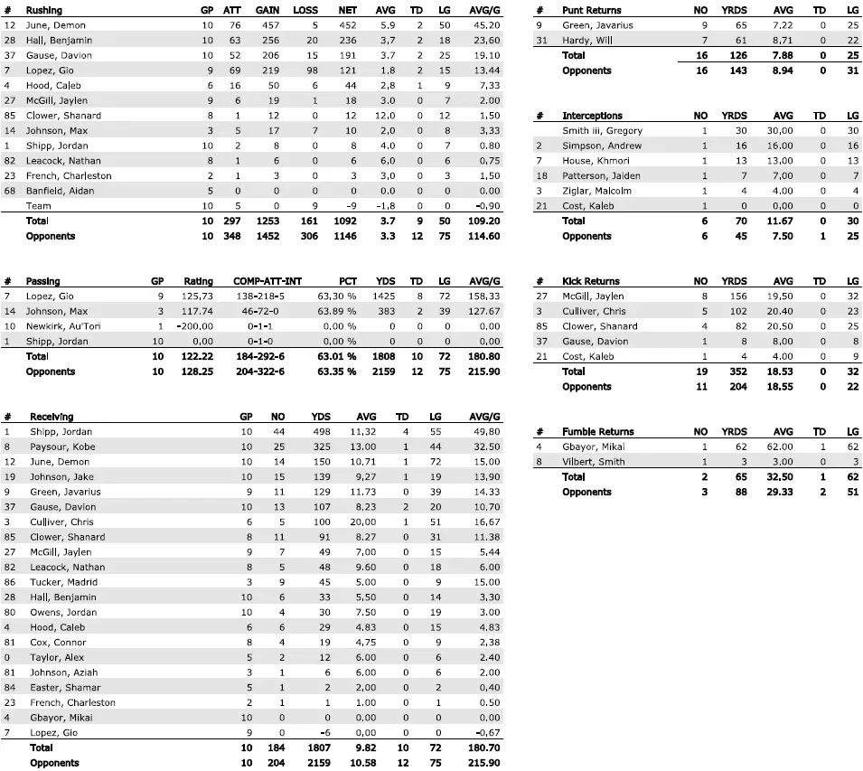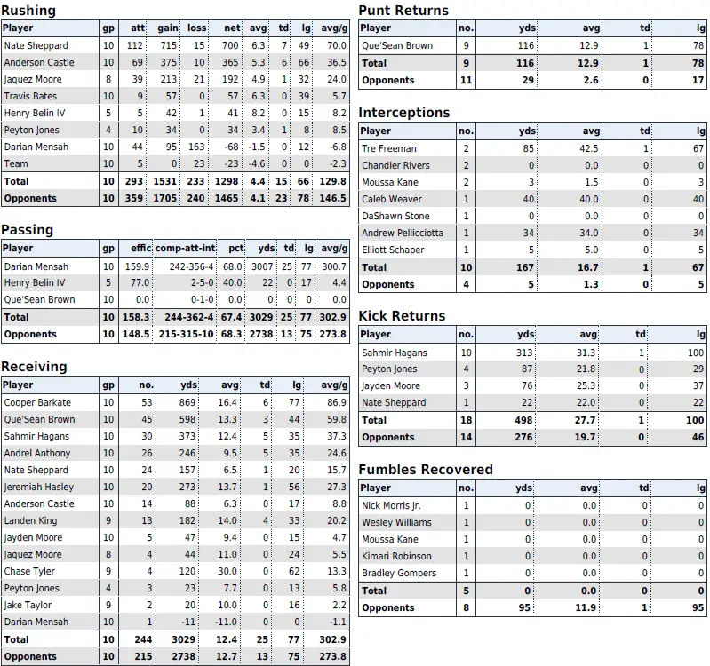 — QB Darian Mensah: 3,007 yards, 25 TDs, 4 INTs, 68% completions