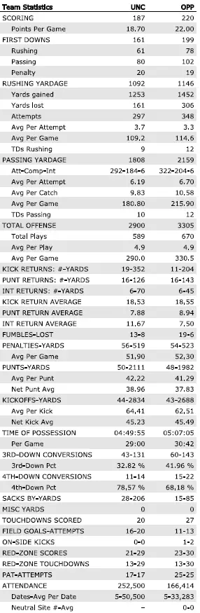 UNC vs. the spread: 5–5 — covered vs. Charlotte -17½ (20–3 win), Richmond -28½ (41–6 win), California +3½ (21–18 loss ) and Virginia +6½ (17–16 loss) and at Syracuse +2½ (27–10 win); failed to cover against TCU +10½ (48–14 loss), UCF +13½ (34–9 loss), Clemson -14½ (38–10 loss), Stanford -7½ (20–15 win) and Wake Forest -5½ (28–12 loss)