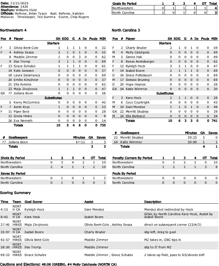 A shot by Northwestern’s Grace Schultze deflected off UNC’s Sietske Bruning and into the cage for a golden goal 9:23 into overtime, giving No. 3 Northwestern a 4–3 victory Friday at Williams Field.