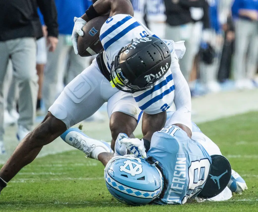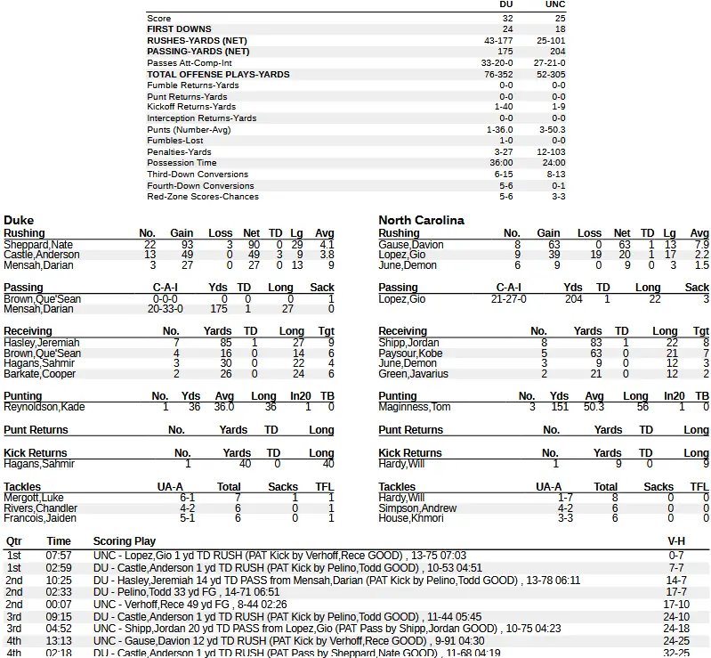 Duke kicker Todd Pelino ran 26 yards to the UNC 1 before getting pushed out of bounds, making Duke 5 of 6 on fourth-down conversions. Running back Anderson Castle ran it in from there, and quarterback Darian Mensah passed to Nate Sheppard for the two-point conversion to give Duke its winning margin with 2:18 left.