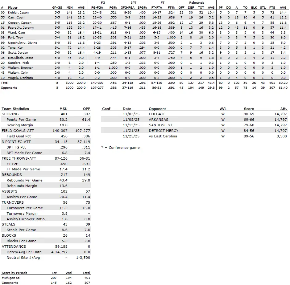 — The Spartans scored a season-high 89 points against ECU as the program moved to 166–47 all-time in November.