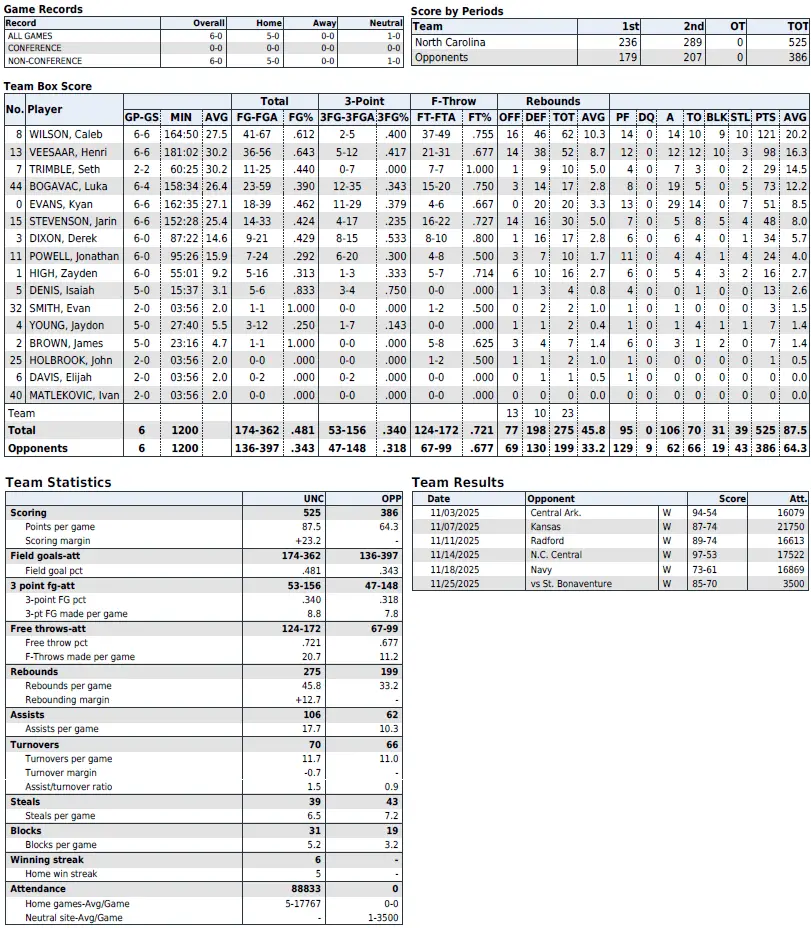 UNC season statistics