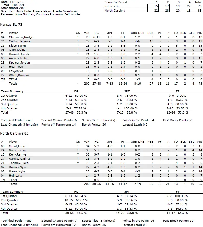 Lanie Grant scored a season-high 15 points and a career-high four 3-pointers as UNC tied the program single-game record of 14 3-pointers. The Tar Heels eased to an 85–73 victory over Kansas State at the Hard Rock Hotel Riviera Maya to extend their win streak to five.