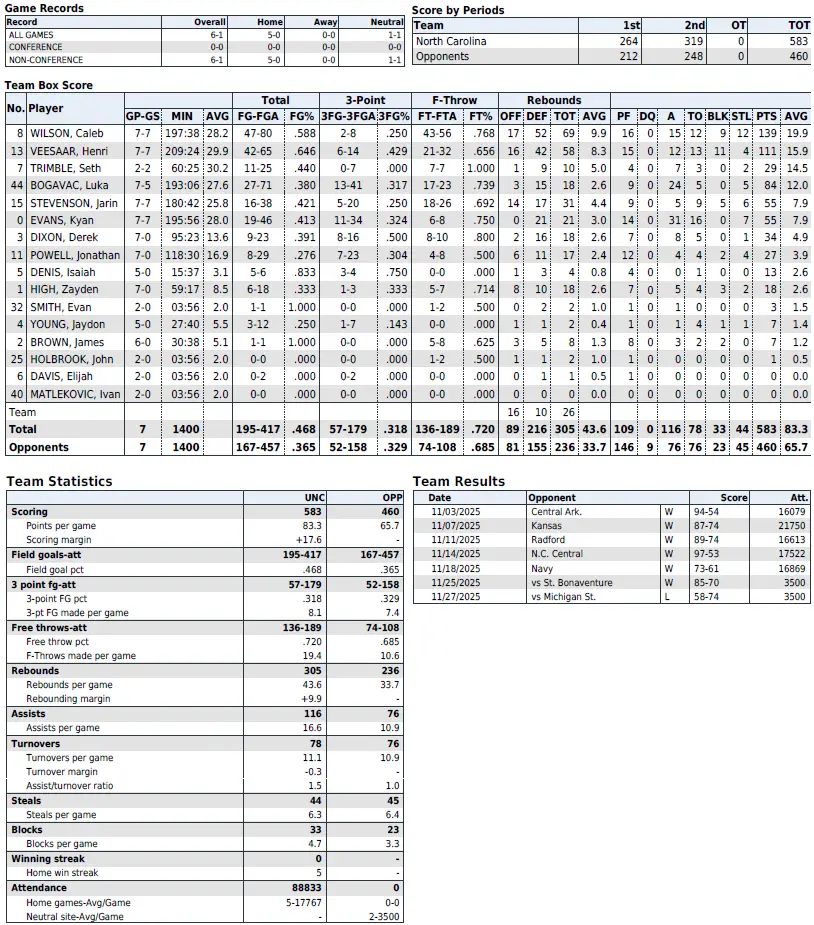 Coach Hubert Davis notably went with an “iron five” during Carolina’s run to the 2022 national championship game. He has more talent on the bench this season, but the substitution patterns, which Assistant Coach Brad Frederick mainly engineers, show that the trust in that group has been limited. UNC (6–1) got outscored by a combined 41–16 in bench scoring Thursday and in the win over Kansas.