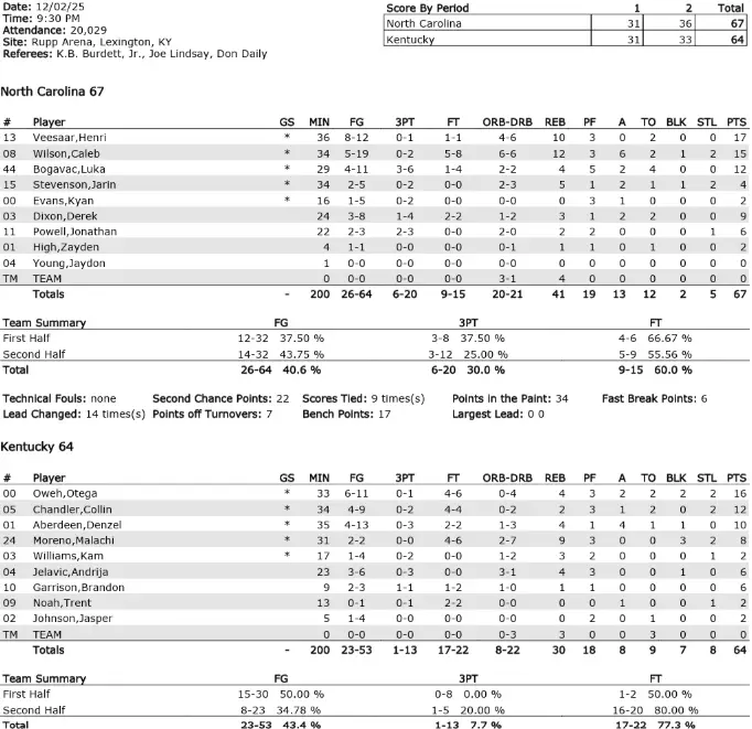 Kentucky opened the second half with an 8–2 run to go up by six. UNC responded with a 9–2 run, but the Wildcats then scored seven in a row to lead by five at the 12:16 mark. Veesaar scored seven consecutive UNC points and nine of 11, with his driving dunk cutting UK’s lead to two at the 10:22 mark.
