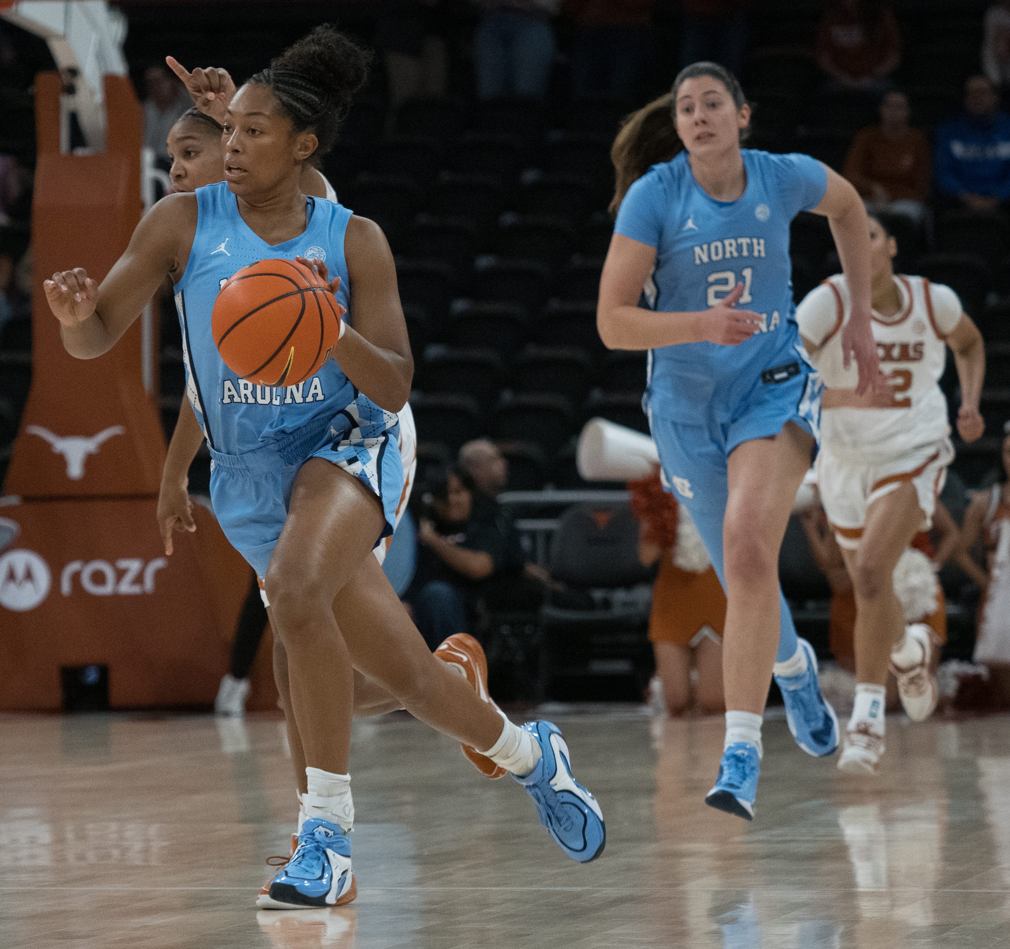 Nyla Harris scored every point in a 5–2 UNC run to start the second half to trim the lead to five, but two Justice Carlton buckets began the decisive 15–4 Texas run to go up by 16 points at 2:18 of the third quarter.