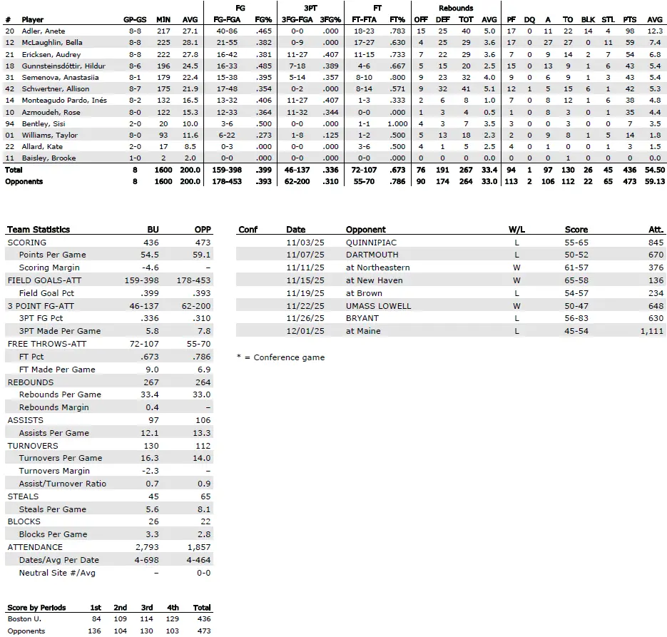 Boston University season statistics
