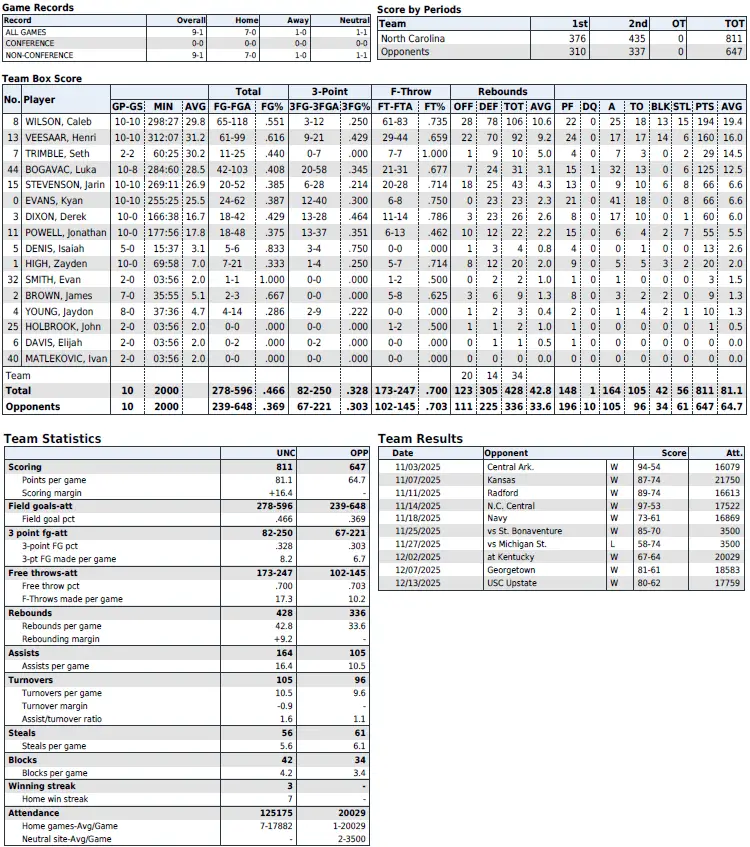UNC season statistics