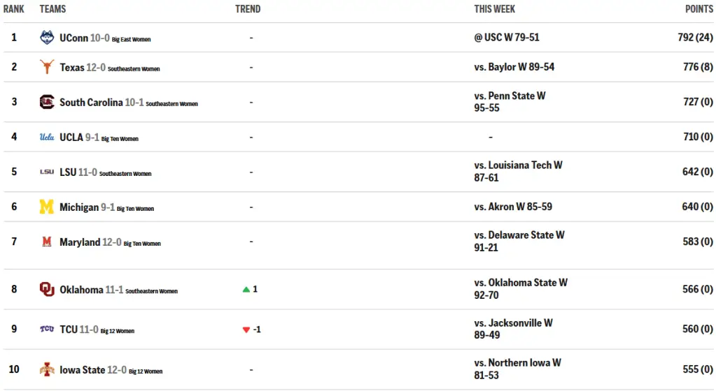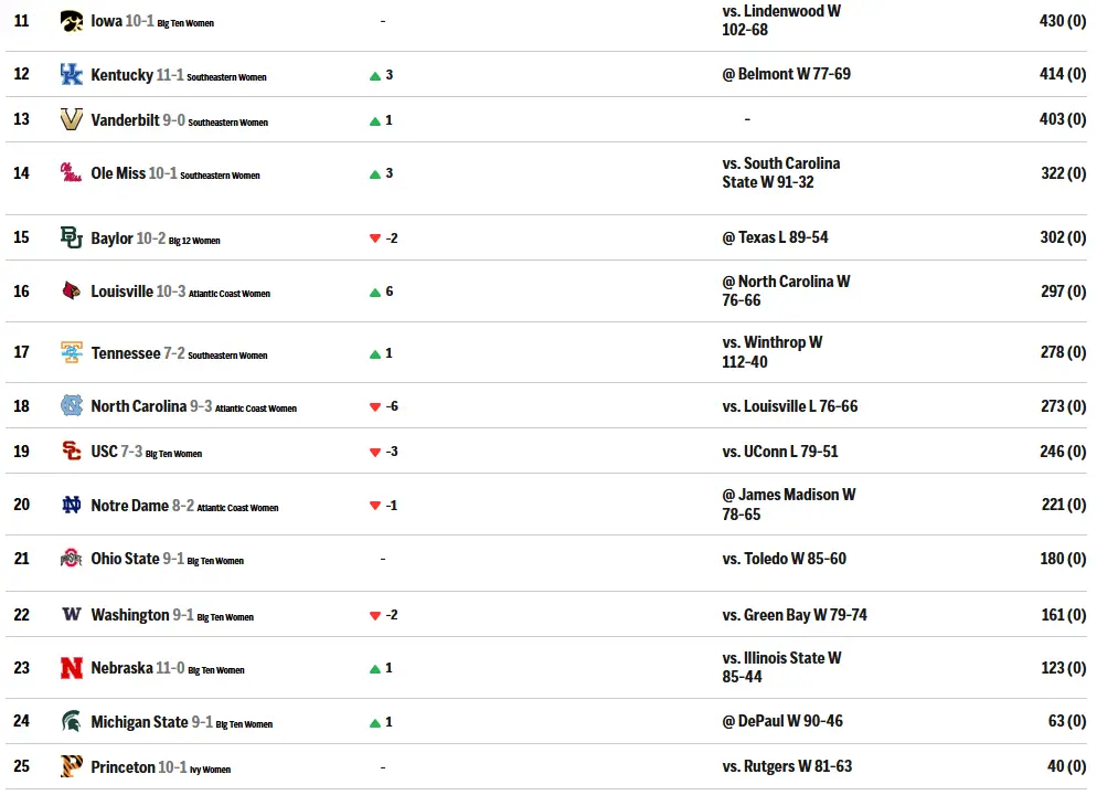 — Iowa (10–1), which stayed at No. 11 after a 74–49 loss to Iowa State (12–0), which stayed at No. 10.