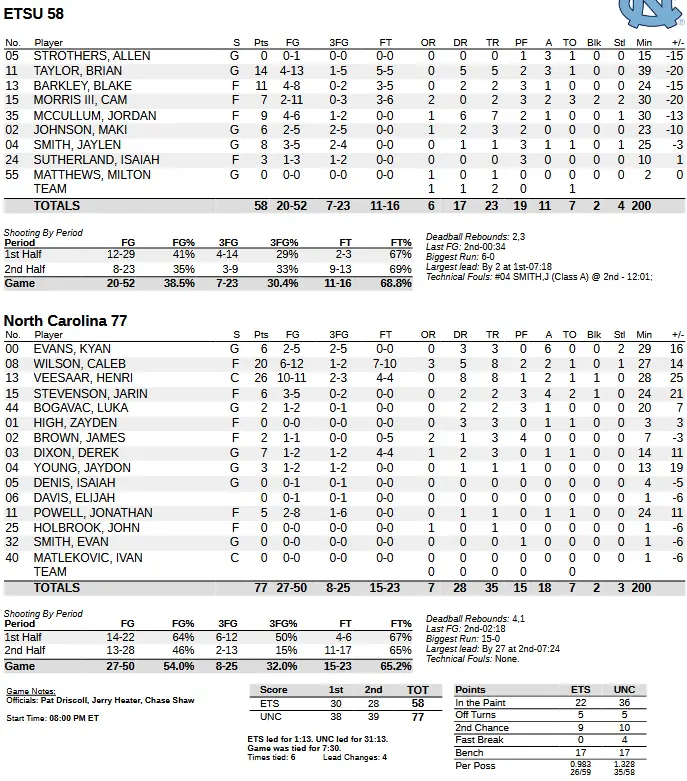 The Buccaneers used most of the shot clock many times, scoring eight first-half points at the end of the shot clock. Or, as UNC coach Hubert Davis said, ETSU (8–4) was methodical.