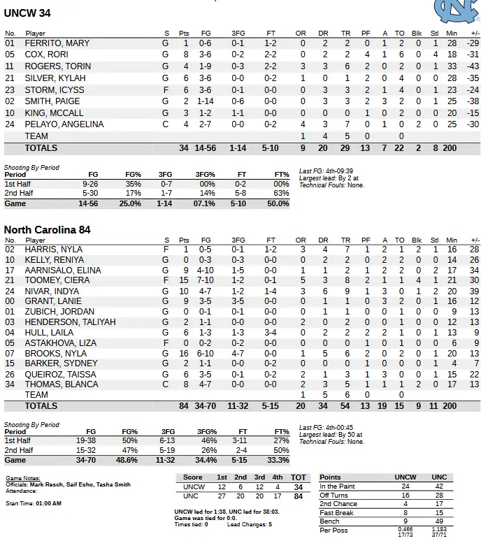 UNCW didn’t score a field goal in the last 9:39 as UNC finished off the win with 17–1 run. The lead reached 50 on Taissa Queiroz’s layup with 45 seconds left.