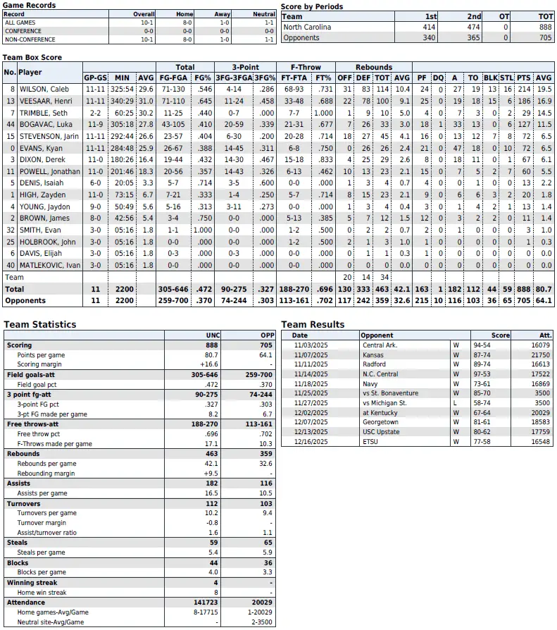 — With a win, UNC, 10–1 for the first time since 2017–18, would earn its first start of at least 11–1 since going 11–1, 12–0 and 12–0 consecutively in 2006–07, 2007–08 and 2008–09. This is the 43rd time that Carolina has started either 10–1 or 11–0.