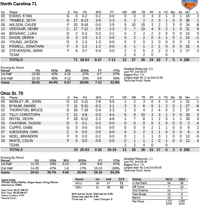 The Buckeyes responded with an 11–2 run to tie it with 54 seconds left before Derek Dixon’s 3-pointer 14 seconds later gave UNC a 34–31 halftime lead.