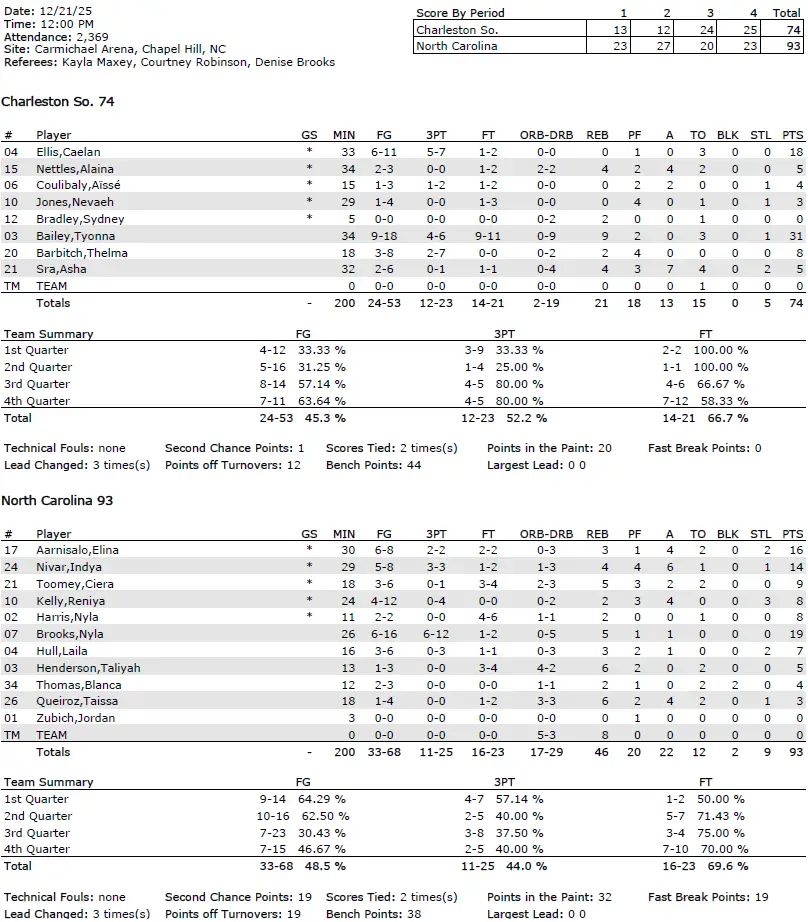 A Charleston Southern 3-pointer sandwiched by UNC turnovers gave the Buccaneers the lead, 13–11, but senior guard Indya Nivar (14 points, team-high 6 assists, 4 rebounds) scored her first points from downtown, and Brooks followed up from the corner to regain a four-point lead.