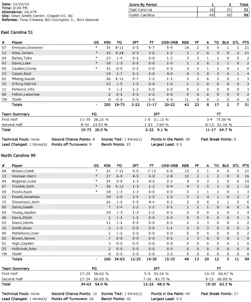 Big ECU center Giovanni Emejuru led ECU with 21 points and 14 rebounds.—UNC gets a week off before opening ACC play at home Tuesday, Dec. 30, against Florida State in one of only three home games between now and Feb. 2. The Seminoles (7–6), who have struggled under first-year coach Luke Loucks, beat Jacksonville 87–63 at home Monday night.