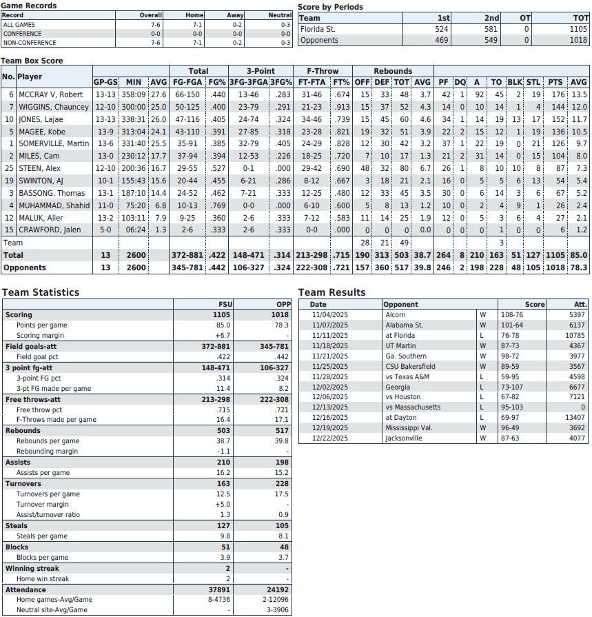 — Florida State prioritizes up-tempo play with a high volume of 3-point attempts, influenced by first-year Seminoles coach Luke Loucks’ NBA background, with the style modeled after Alabama’s under Coach Nate Oats. The Seminoles rank second nationally in 3-point attempts per game (36.2), 12th in 3-pointers per game (11.4), but 281st in 3-point shooting percentage (31.42%; 16th in the ACC).