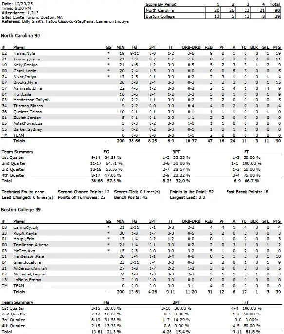 Toomey’s layup stretched UNC’s run to 18–0 as BC finally ended a long scoring drought 77 seconds into the second half. BC pulled within 24 before Carolina finished the third quarter with 14 consecutive points to lead 69–31.