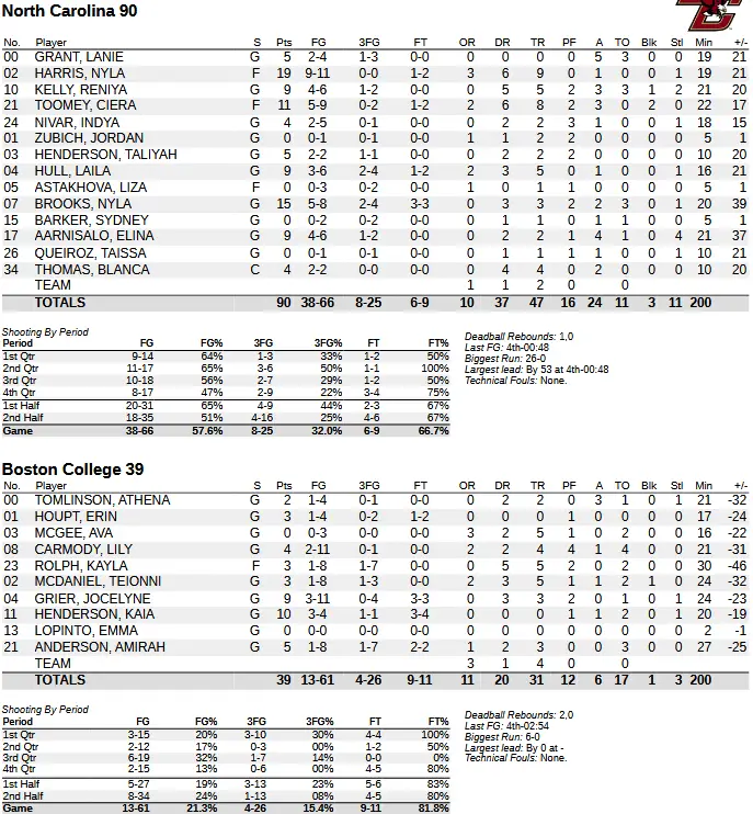 Toomey’s layup stretched UNC’s run to 18–0 as BC finally ended a long scoring drought 77 seconds into the second half. BC pulled within 24 before Carolina finished the third quarter with 14 consecutive points to lead 69–31.