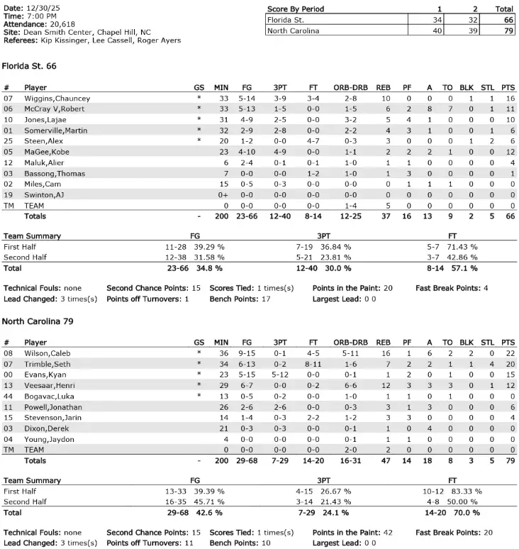 FSU sliced its deficit to 10 as Carolina went scoreless for nearly four minutes before an Evans 3-pointer at 6:34 that started a 7–2 run as UNC went up by 15 with 5:53 left. FSU never got closer than 13 points after that.