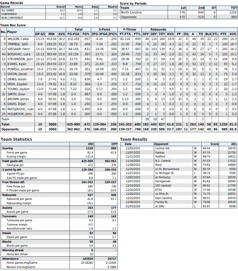 The loss was UNC’s second of the season, both coming when the Tar Heels struggled to score for long stretches. Freshman Caleb Wilson went through a 20-minute drought against Michigan State and another extended dry spell at SMU.