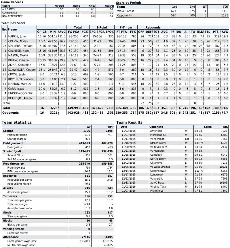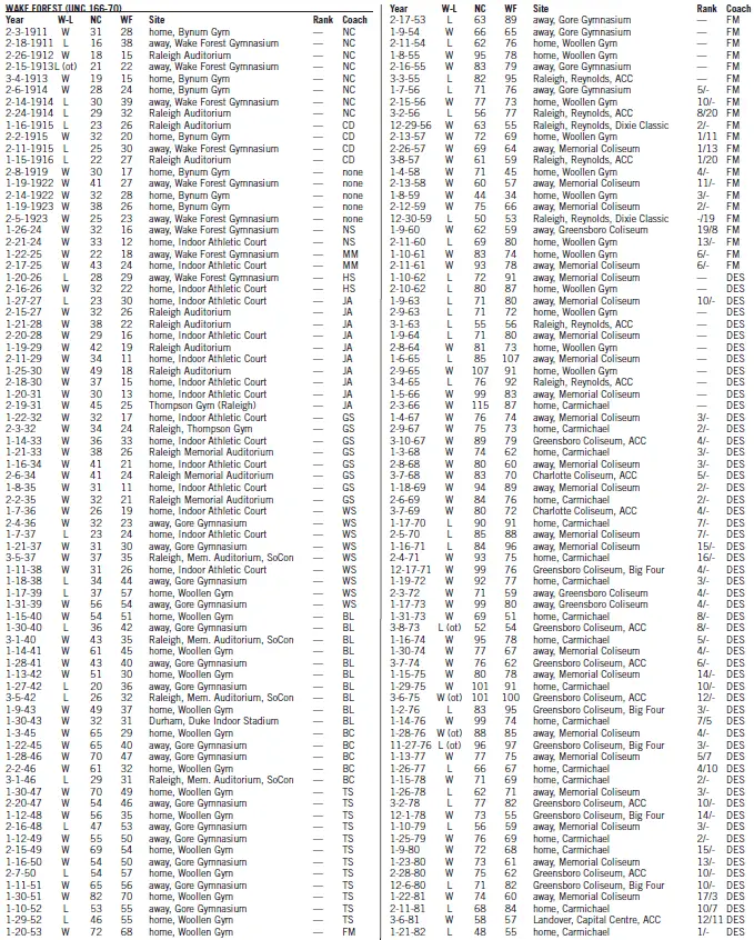 | Wake Forest | 1–2 | 10–6 | 70 |