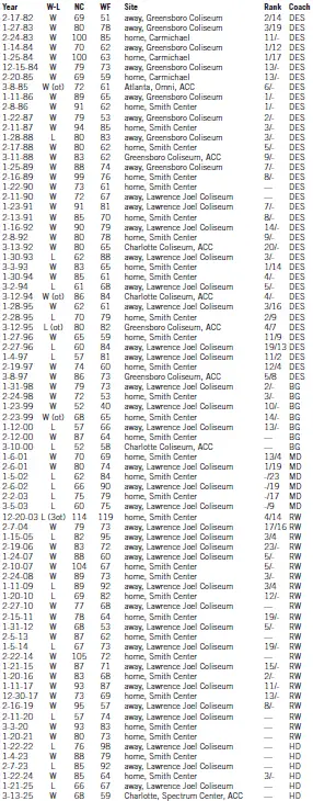 Coaches: Steve Forbes (232–114 in 11 seasons; 102–71 in 6th season at Wake Forest) and Hubert Davis (114–47 in fifth season, all at UNC; was 228–95 in nine seasons as a UNC assistant coach)
