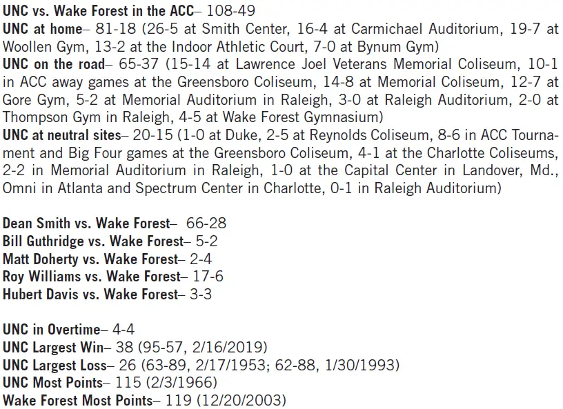 Series: UNC leads 166–70 (see list below), including 26–5 in the Smith Center, winning three of the last five and five of the last eight overall games and the last nine Smith Center meetings. The Deacons’ last win in Chapel Hill was 92–69 on Jan. 20, 2010.